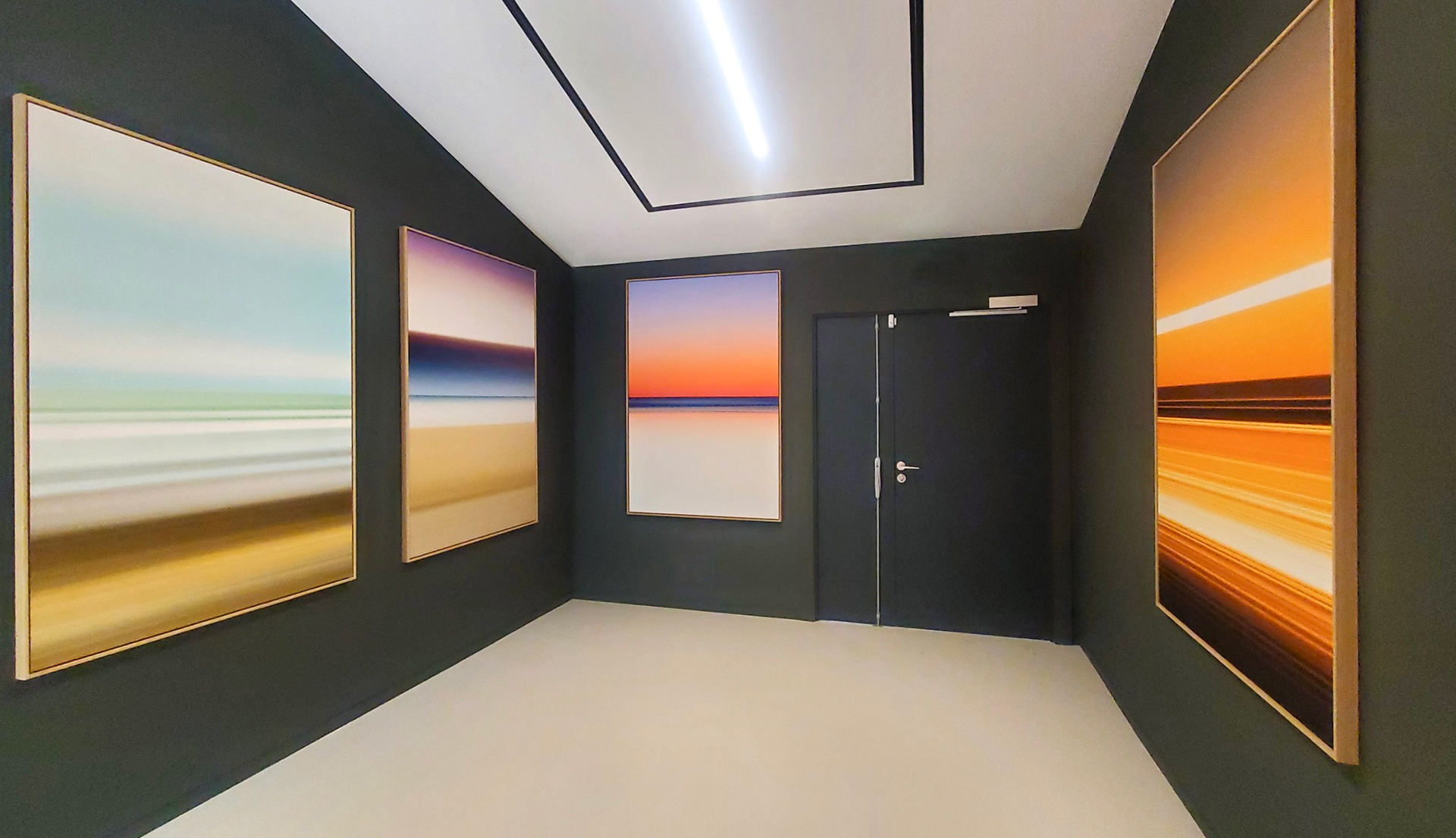 En supprimant les détails susceptibles d’arrêter le regard, le geste photographique met ici la fonction mimétique à distance afin de restituer l’état contemplatif éprouvé face à l’horizon marin, un état perceptif que la photographie classique échoue à retranscrire. Le paysage se condense alors sous forme de surface, où lumière et couleur se combinent en un tableau abstrait.